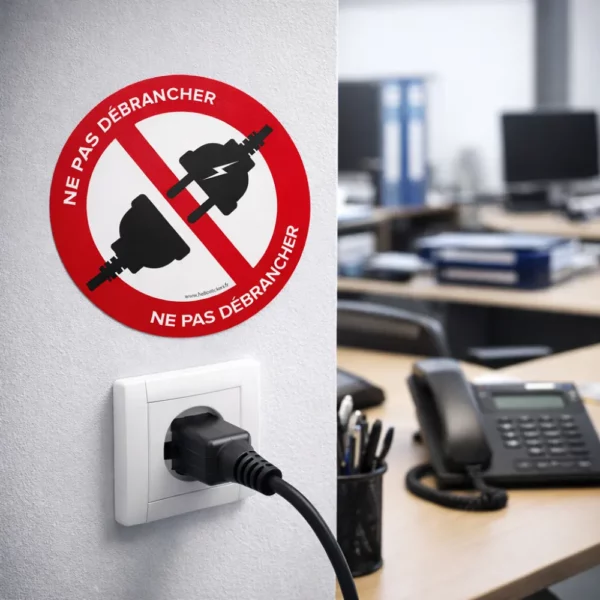 Le sticker “Ne pas débrancher la prise”, aussi appelé autocollant d’avertissement électrique, est la solution idéale pour éviter toute coupure involontaire d’alimentation. Clair, visible et immédiatement compréhensible, il permet de protéger vos équipements essentiels contre les débranchements accidentels, que ce soit à la maison, au bureau ou en milieu professionnel.