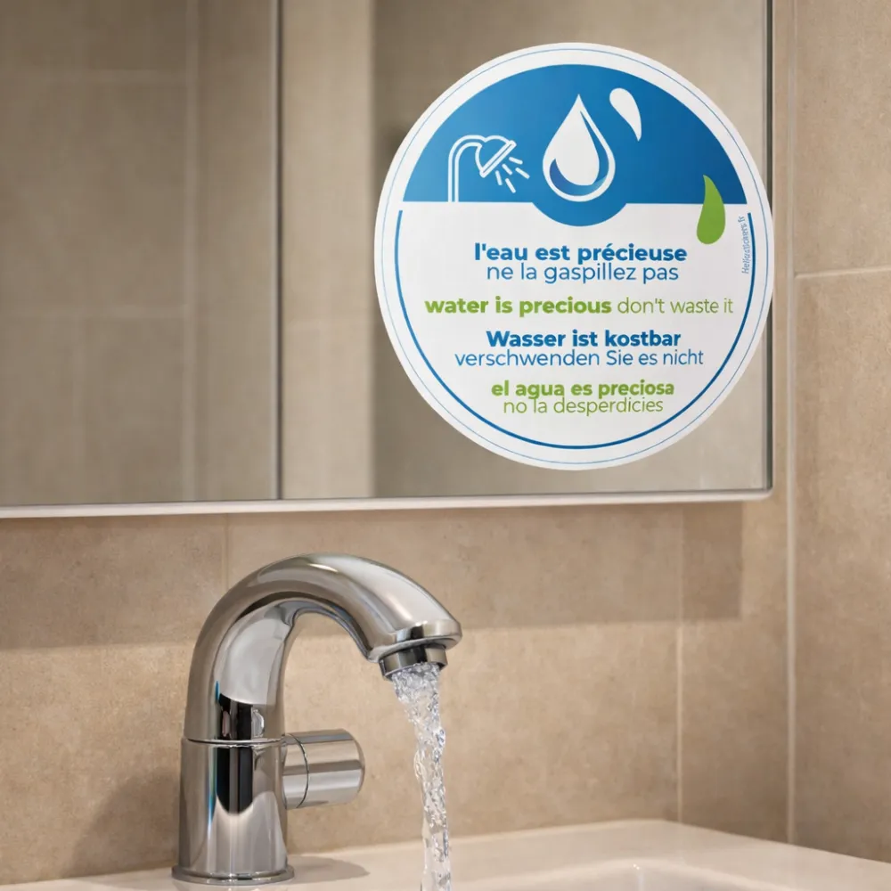 Agissez concrètement pour la planète : installez ce sticker économie d’eau multilingue et participez activement à la réduction du gaspillage.